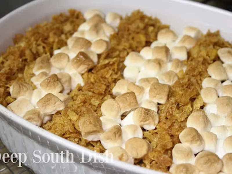 A nostalgic casserole combining creamy sweet potato and banana base with alternating stripes of buttery cornflake topping and toasted mini marshmallows. Warm spice notes from vanilla and pecans make this ideal for holiday tables or potluck gatherings. The textural contrast between the soft filling and crispy-chewy topping distinguishes this from standard sweet potato casseroles.