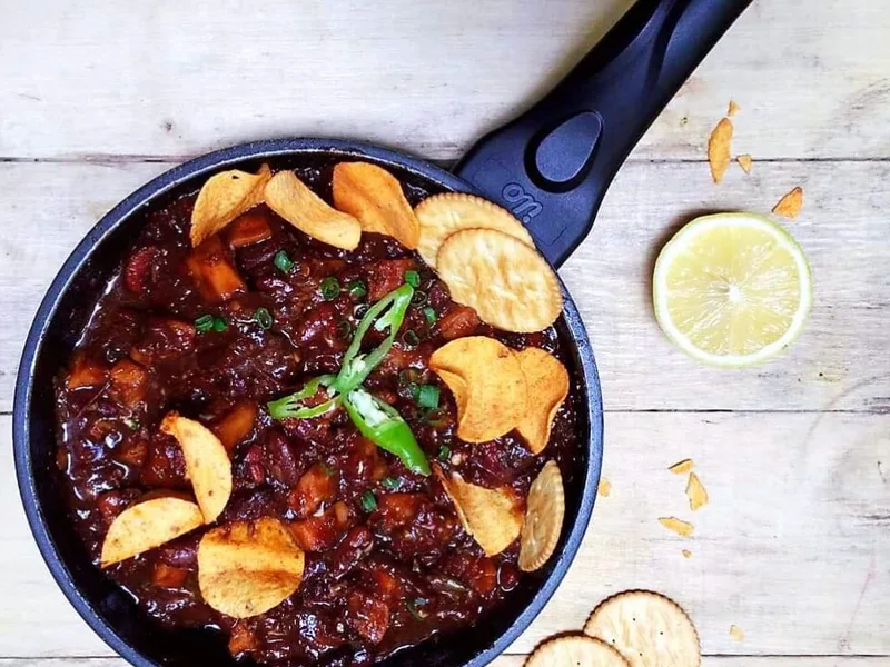 This Filipino-inspired chili jam combines roasted tomatoes, sweet potatoes, and black beans into a complex preserve that balances heat, sweetness, and umami. Crispy fried kamote cubes coated in Greek seasoning provide textural contrast, while cocoa powder and apricot preserves add depth beneath habanero heat. The roasting concentrates tomato flavor before simmering with orange juice and coriander seeds. This spreadable chili works for adventurous home cooks seeking beyond-basic condiments. Serve alongside grilled meats, cheese boards, or as a glaze for roasted vegetables. It's ideal for entertaining or preserving the season's harvest. The jam-style consistency and jarring method set it apart from traditional chili con carne, creating a shelf-stable condiment with layers of sweet, spicy, and savory notes.