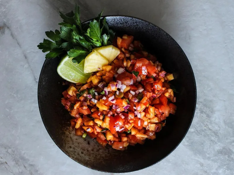 Bright, tangy salsa combining fresh pineapple, tomatoes, and red onion with Korean gochujang for a sweet-spicy kick. The lime juice and cilantro add freshness while gochujang brings depth and heat. Serve alongside grilled fish, tacos, chips, or as a topping for bowls. This version bridges tropical and umami flavors, perfect for summer entertaining or adding interest to weeknight proteins.