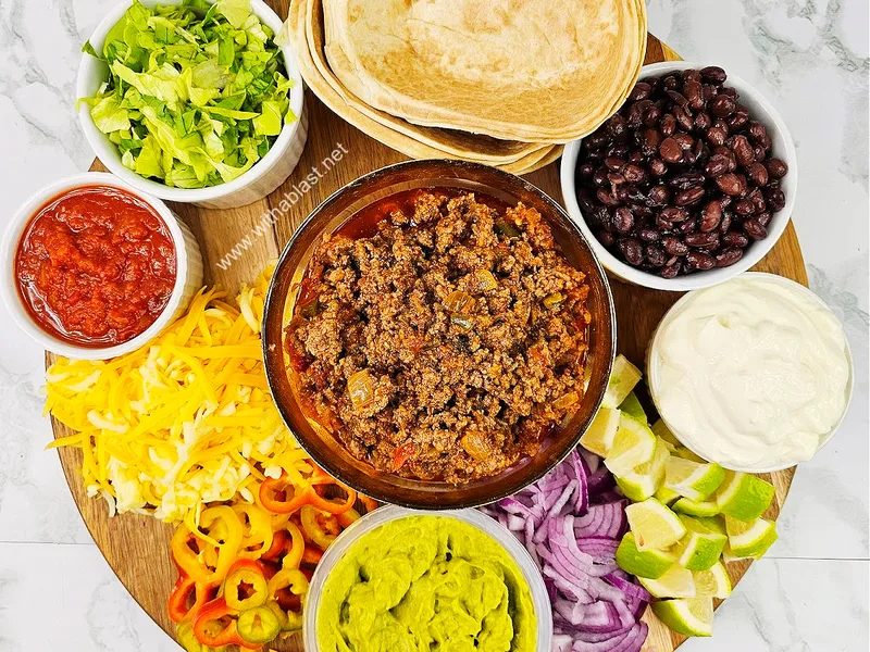 Interactive taco board featuring seasoned ground beef served warm in a center bowl, surrounded by assembled tortilla boats and an array of fresh toppings including sour cream, salsa, guacamole, shredded cheeses, black beans, and vibrant garnishes. Each diner builds their own customized boats.
