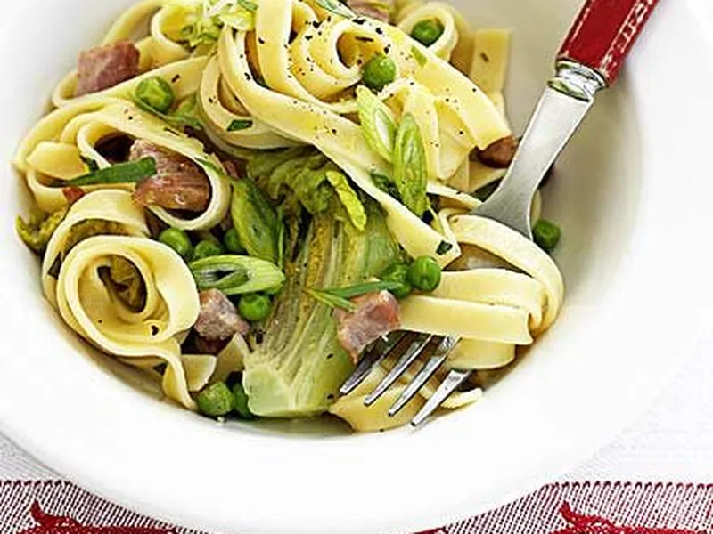 Fresh tagliatelle tossed with crispy bacon, sweet peas, and spring onions in a light vermouth and creme fraiche sauce, finished with tender Little Gem lettuce and tarragon. A quick, elegant weeknight pasta that balances richness with bright green vegetables.