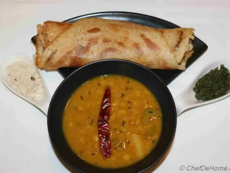 A vibrant South Indian lentil curry balancing earthy toor dal with tangy tamarind and warm spices. Mixed vegetables add texture and nutrition, while the final tempering of mustard seeds and dried red chili creates an aromatic finishing touch. Serve as a comforting main course with rice or flatbread for lunch or dinner. This version emphasizes the tamarind-forward flavor profile and includes optional vegetable variations for seasonal flexibility.