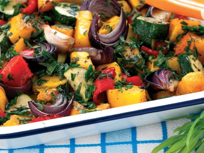 Sheet pan roasted vegetables with butternut squash, peppers, courgettes, and garlic finished with bright tarragon, chives, lemon zest and juice. Tender and lightly charred, serve warm with pasta or chilled as a side.