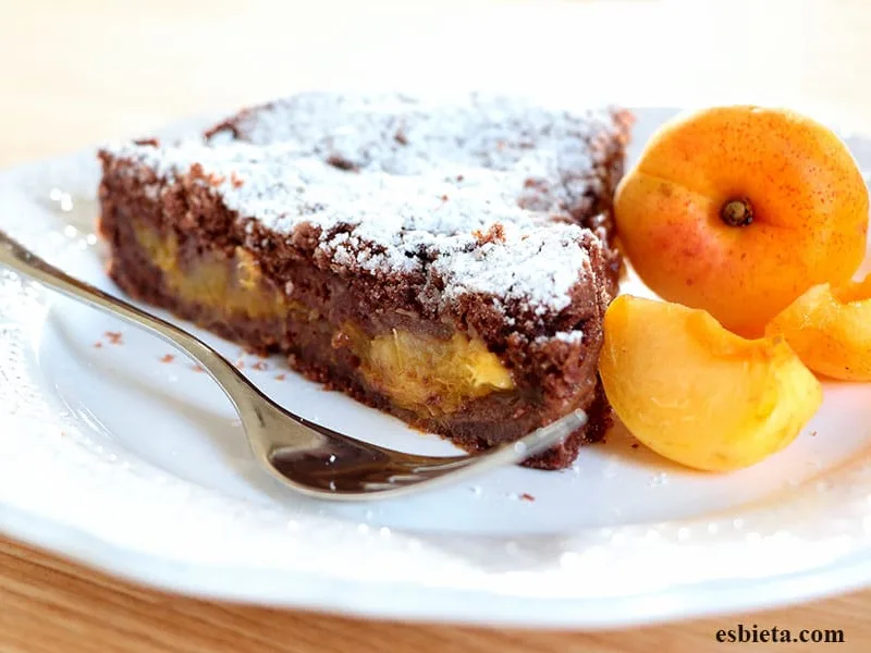 A rustic chocolate tart with a buttery crumb topping and fresh apricots baked between two layers. The cocoa-infused base and crumble create a tender, cookie-like texture. Baked until golden with a subtle chocolate aroma, finished with a dusting of icing sugar.