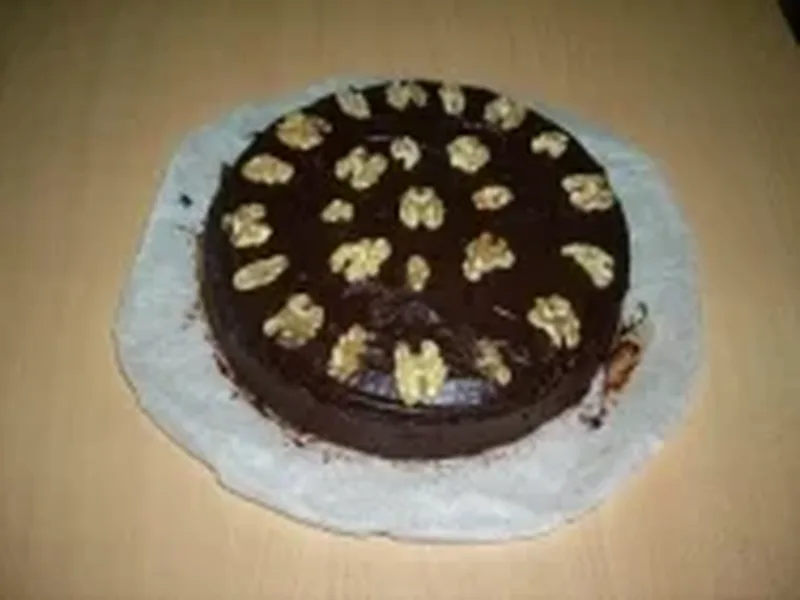 Spanish sponge cake layered with raspberry jam and topped with vanilla chocolate ganache. Fluffy egg white batter studded with chopped walnuts, baked until golden, then filled and finished with melted chocolate glaze and whole walnut garnish.