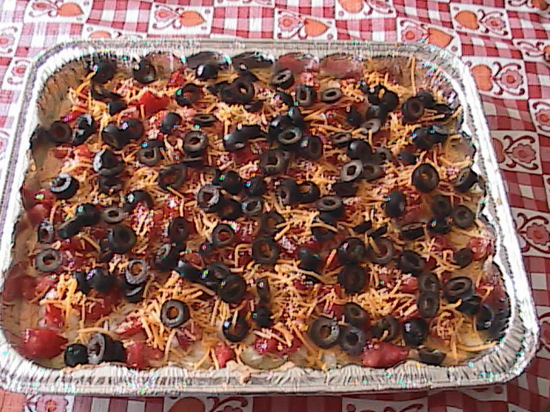 Top with chopped onions, then tomatoes, cheese, and olives in layers.