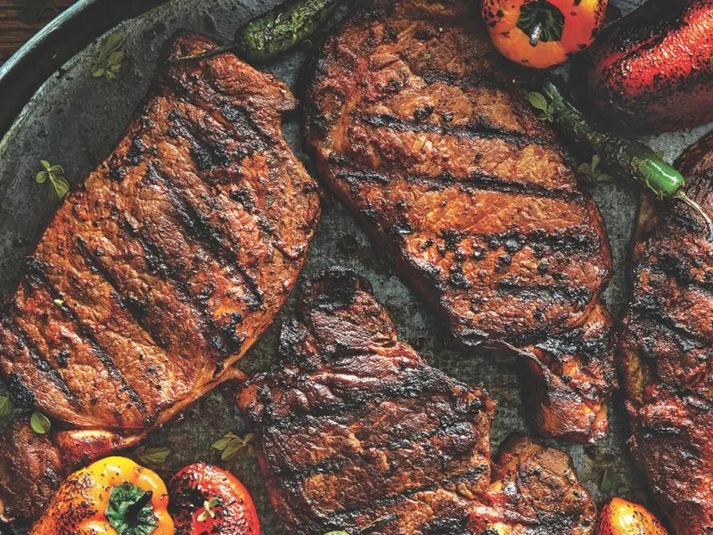Grilled rib-eye steaks coated in a bold spice paste of toasted fennel, coriander, cumin, and mustard seeds, combined with oregano, chipotle chiles, garlic, and lemon juice. Marinated and grilled to medium-rare, this Argentine-inspired Texas preparation delivers smoky heat and aromatic depth in every bite.