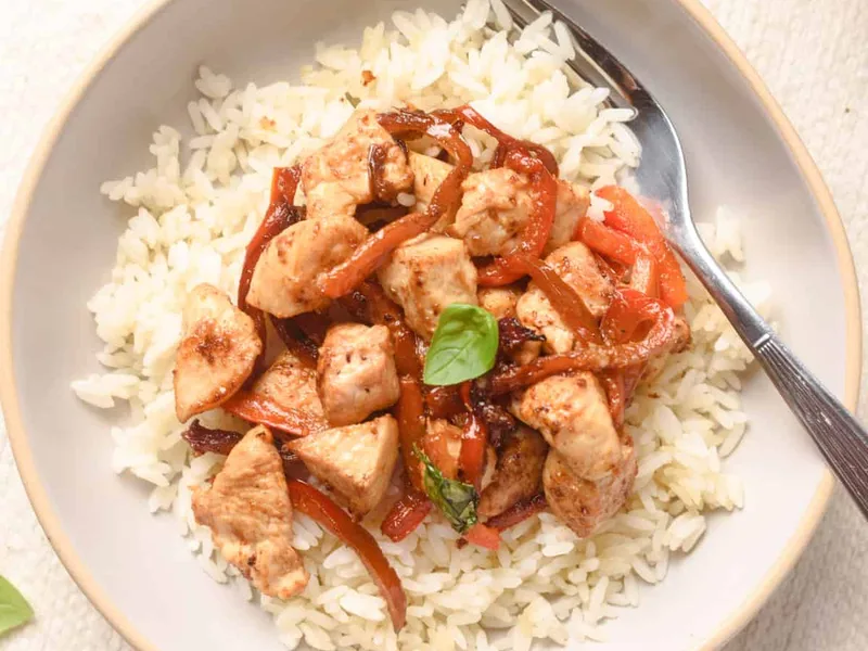 Prep all ingredients in advance: slice peppers, measure basil, mince garlic. Cook only when ready to serve; the stir-fry loses textural quality if held.
