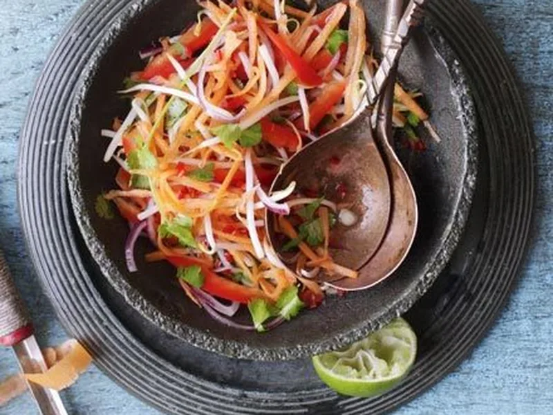 Crisp grated carrots tossed with red pepper, red onion, and beansprouts in a tangy fish sauce and lime dressing. Fresh chilli and coriander add brightness to this quick, vibrant side dish that pairs well with grilled meats or curries.
