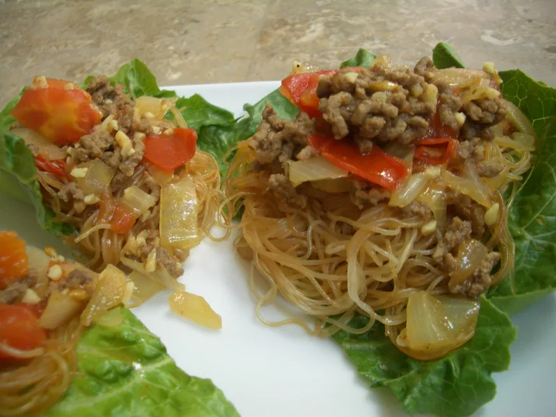 Arrange lettuce on plates. Top with noodles, then beef sauce. Sprinkle with pepper and sambal oelek.