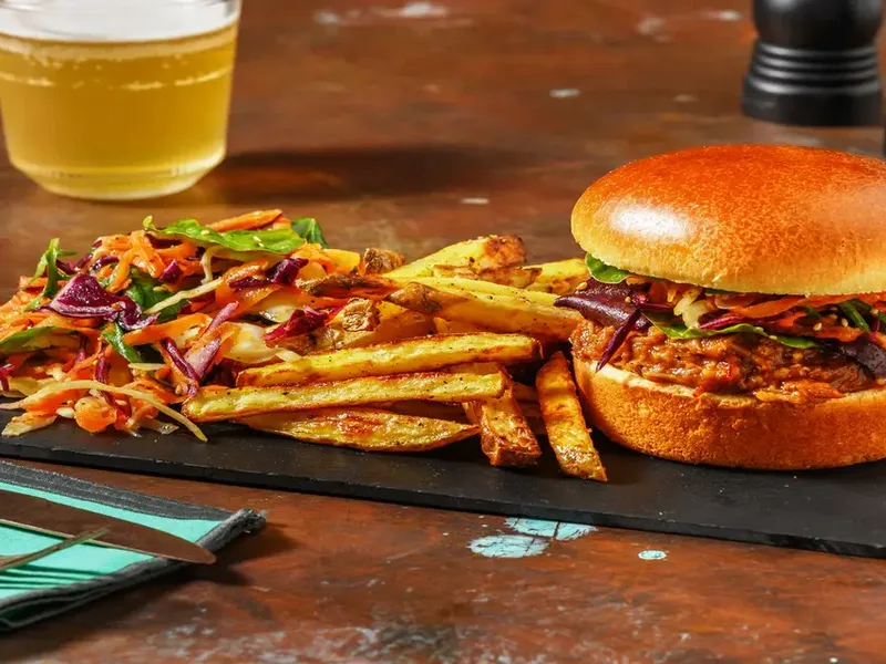 British slow-cooked pork shredded and combined with red Thai paste, sweet chilli, and hoisin sauce, served on toasted buns with crispy homemade chips and sesame-dressed coleslaw. Quick assembly of pre-cooked components yields a vibrant, tangy meal with contrasting textures.
