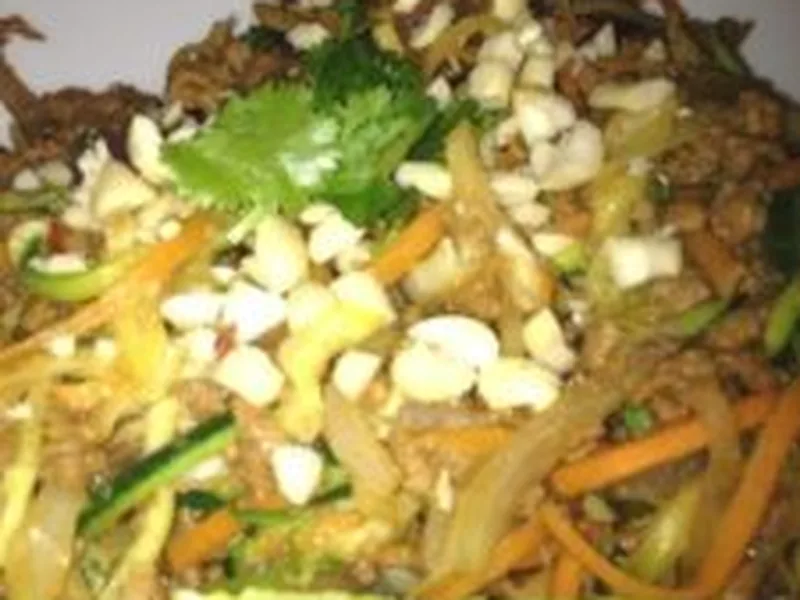 Crackslaw is a stir-fried vegetable and plant-based protein dish inspired by Asian slaw traditions, combining shredded and julienned raw vegetables with cooked Quorn or TVP for texture contrast. This Thai version brings together aromatic lemongrass, creamed coconut, and bright lime juice for a fragrant, subtly sweet and tangy profile balanced by umami from soy and fish sauce. The dish delivers crisp vegetables against tender Quorn, topped with toasted peanuts and fresh cilantro for layers of flavor and crunch. It's ideal for vegetarians and vegans seeking quick, satisfying plant-based meals with bold Southeast Asian character. Serve it as a light lunch, quick weeknight dinner, or part of a Thai-inspired spread. What sets this version apart is the combination of raw vegetable structure with warm Quorn and coconut-lemongrass aromatics, creating complexity in under 15 minutes without heavy cooking.