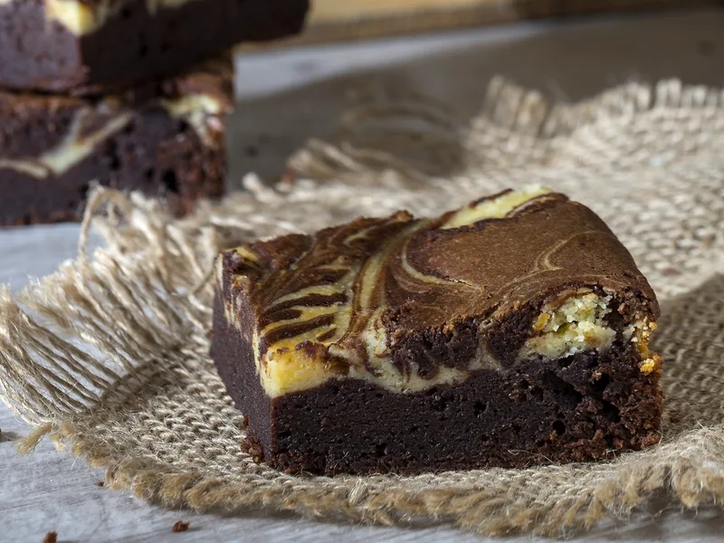 Dense, fudgy brownies with a creamy cream cheese layer swirled throughout. Melted butter and semisweet chocolate create a rich base, topped with a tangier cream cheese mixture and finished with chocolate swirls. Bakes to a risen, slightly underbaked center that sinks as it cools, yielding that prized fudgy texture.