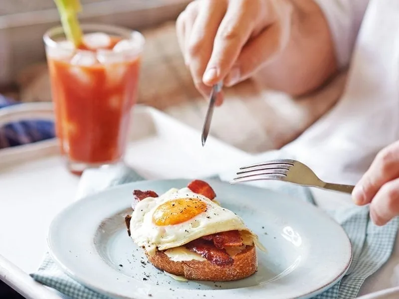 Bacon can be cooked 2 hours ahead and reheated gently. Toast sourdough just before serving.