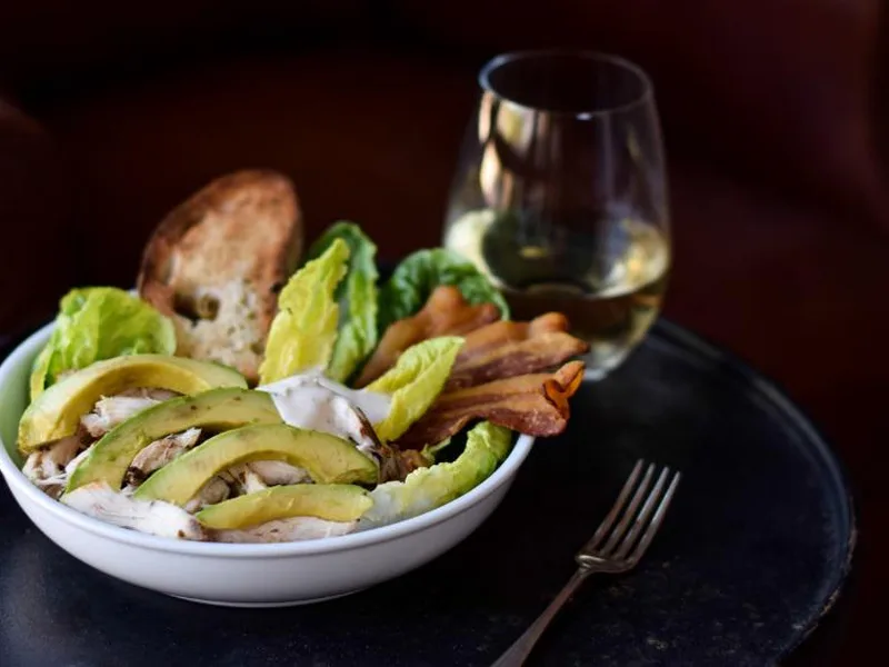 A composed Caesar salad featuring herb-marinated roasted chicken with bacon, romaine lettuce, avocado, and creamy anchovy dressing. The chicken is butterflied and roasted at high heat with soy sauce and white wine, while a blended anchovy-creme fraiche dressing replaces traditional mayo-based versions.