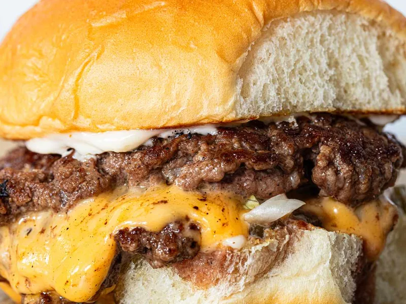Double-patty smash burger with two thin, crispy beef patties and melted cheese stacked together. Ground chuck is smashed flat in a hot pan to develop a caramelized crust, then topped with cheese and served on a buttered, toasted bun with optional condiments and fresh toppings.