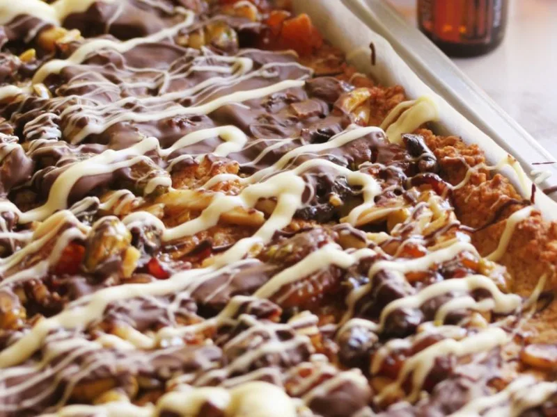 A sophisticated three-layer confection combining a nutty almond-coconut base with spiced honey caramel topping studded with dried fruit, pistachios, and slivered almonds, finished with chocolate drizzle. The Florentine slice balances toasted nuttiness, warm spice notes from cinnamon and mixed spice, and bright citrus undertones with creamy caramel richness. Chewy, crunchy, and indulgent, it suits home bakers seeking showstopping afternoon tea or dessert fare. What distinguishes this version is the aromatics: optional essential oils (orange, lemon, lime, cinnamon bark) deliver concentrated flavor without added moisture, though fresh zest works equally. The Thermomix method speeds preparation significantly, milling the base to precise texture and cooking the caramel to exact temperature control. The result is a restaurant-quality treat that looks far more complex than its straightforward assembly suggests.