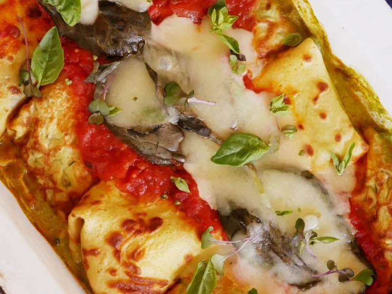 Italian-style crepe manicotti filled with ricotta, spinach, garlic, and three cheeses, then baked in marinara sauce. This Thermomix recipe uses pre-made crepes and sauce for efficiency. The filling combines fresh basil, caramelised garlic, and a blend of mozzarella, parmesan, and cheddar for depth.