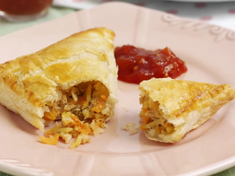 Savory hand pies filled with mild curry rice, seasoned turkey mince, apple sauce, and spicy tomato chutney, wrapped in puff pastry and baked until golden. Nine individual pasties perfect for parties or lunchboxes.