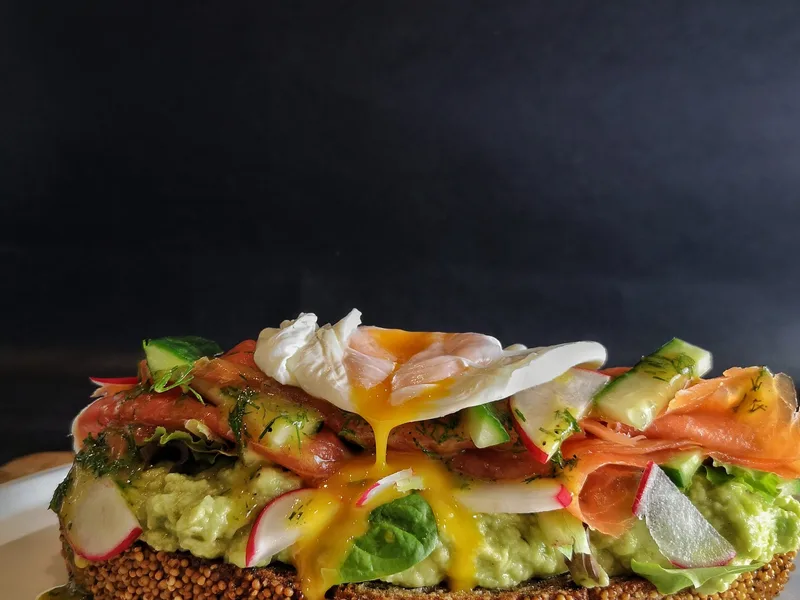 Open-faced sourdough toast layered with whipped avocado, smoked salmon, cucumber, radish, and a runny fried egg. Dressed with a Dijon-dill vinaigrette and pickled radish, this protein-rich brunch showcases bright, fresh flavors with creamy and smoky elements.