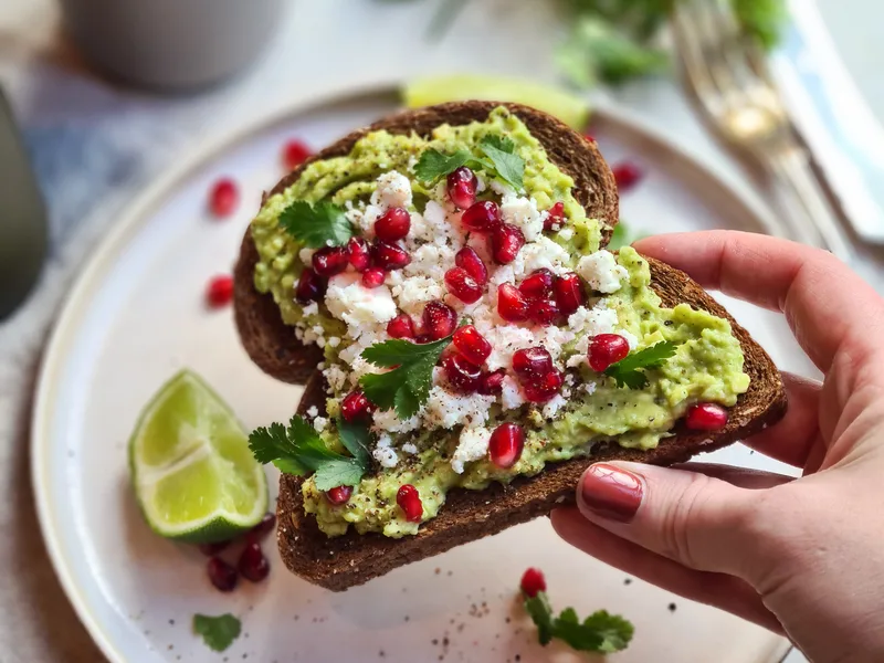 Crispy whole grain toast topped with mashed avocado seasoned with lime juice, salt and pepper, finished with crumbled feta cheese, pomegranate seeds and fresh cilantro. A simple, protein-rich open-faced sandwich ideal for breakfast or light lunch.