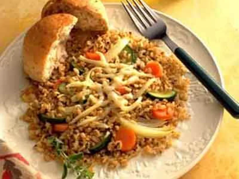 A hearty, nutty grain pilaf combining toasted brown rice and barley with fresh herbs, roasted vegetables, and melted Monterey Jack cheese. The toasting step deepens the grain flavors while vegetables add brightness and texture. Serve as a satisfying vegetarian main or alongside roasted chicken or fish. This version balances whole grains with fresh herbs and seasonal vegetables for a wholesome, weeknight-friendly dish.