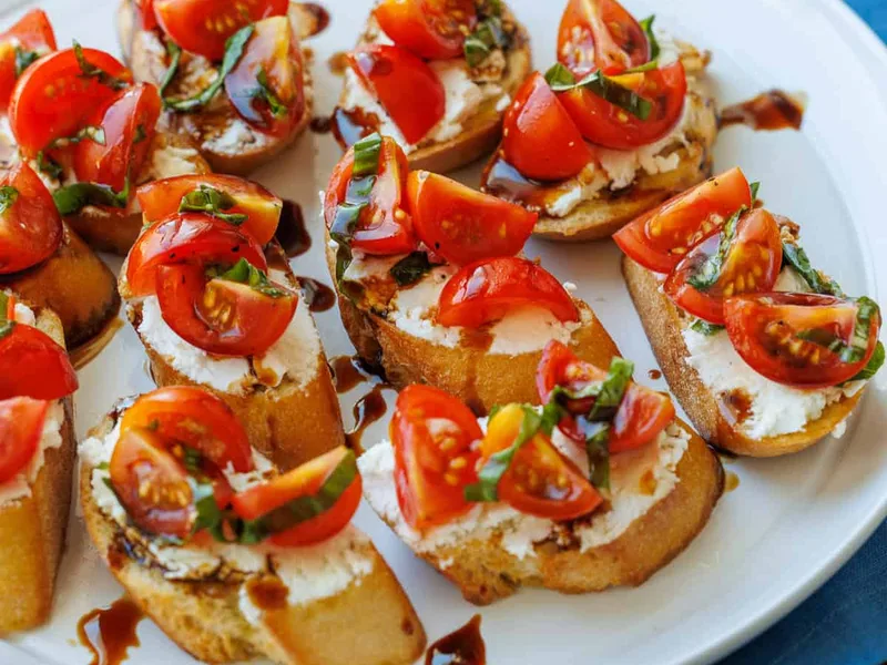 Crispy toasted baguette slices topped with creamy goat cheese and fresh cherry tomato basil mixture, finished with a drizzle of balsamic glaze. Perfect for entertaining, summer gatherings, or elegant appetizers. The combination of tangy goat cheese, sweet tomatoes, and aromatic basil creates a classic Italian-inspired bite that's both sophisticated and approachable.
