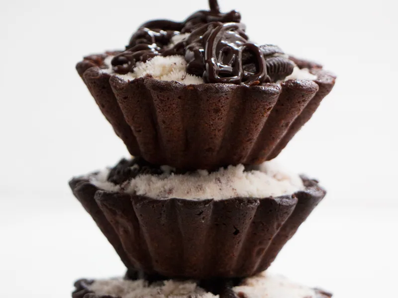 Individual chocolate tartlets with a cocoa-enriched pastry crust, blind-baked until crisp. Filled with ice cream mixed into crushed Oreo cookies and topped with chocolate sauce. A make-ahead dessert requiring chilling and freezing time, ideal for entertaining.