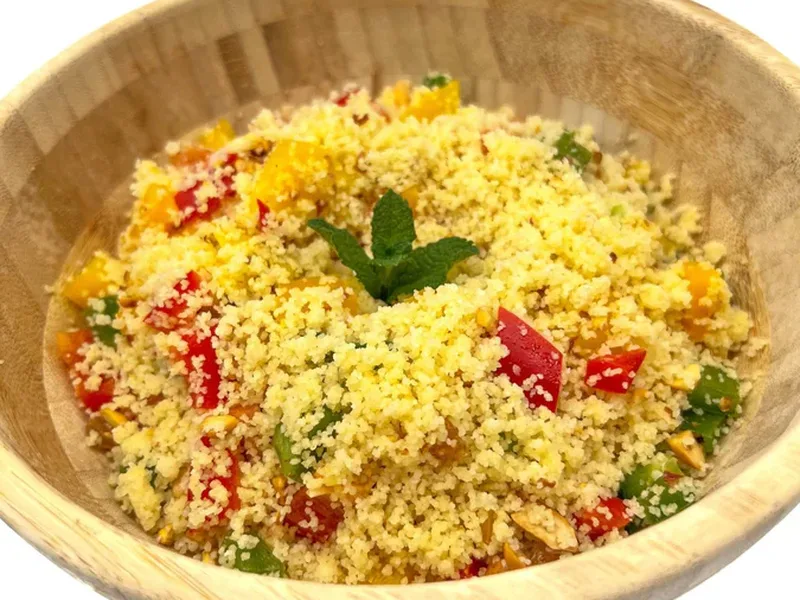 Slice bell peppers very thinly and assemble the salad just before serving to preserve crispness and prevent the vegetables from releasing excess moisture that softens the couscous.