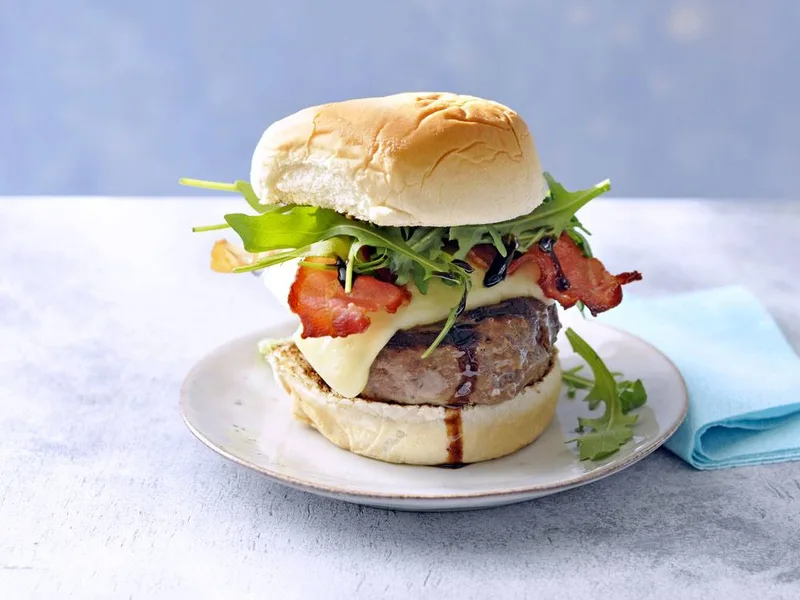 Grill-cooked beef burgers topped with melted Brie, crispy bacon, and peppery arugula, finished with a balsamic glaze. Quick weeknight meal with restaurant-quality toppings that enhance standard burger fare without complicated technique.
