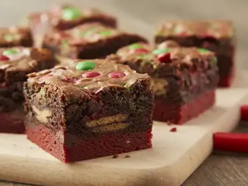 These festive triple-layer brookies combine a red-tinted sugar cookie base, Golden Oreo cookies, and fudgy brownie top studded with colorful M&Ms. Perfect for holiday parties and gift-giving, these indulgent bars offer three distinct textures in every bite. The cookie base provides structure while the Oreos add crunch and the brownie layer brings rich chocolate flavor. The red food coloring gives a subtle holiday touch that pairs beautifully with the green and red candies on top.