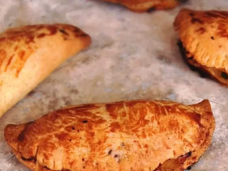 Savory pastry parcels filled with tuna, roasted peppers, onions, tomatoes, hard-boiled eggs, and olives. Blanched tomatoes are peeled and combined with softened vegetables, then sealed in puff pastry shapes and baked until golden. Served at room temperature.