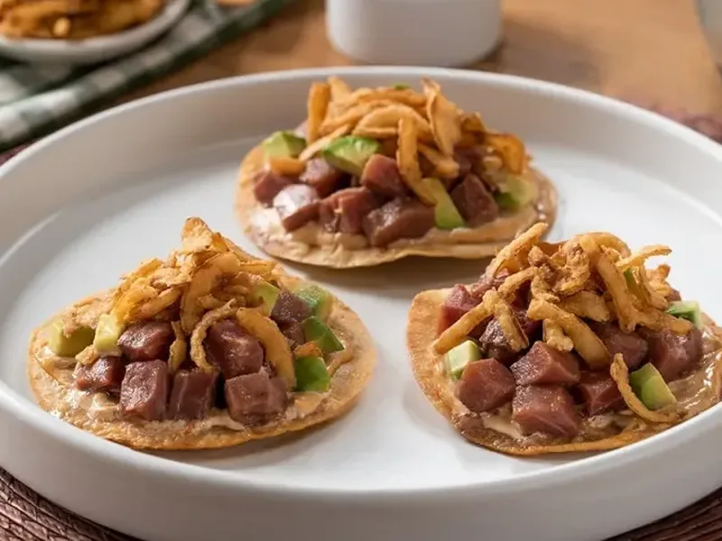 Fried tortilla toasts topped with cubed soy-marinated tuna, creamy chipotle mayonnaise, fresh avocado, and crunchy fried onions. A quick, textured appetizer combining crispy, creamy, and tangy elements with a citrus-soy marinade.