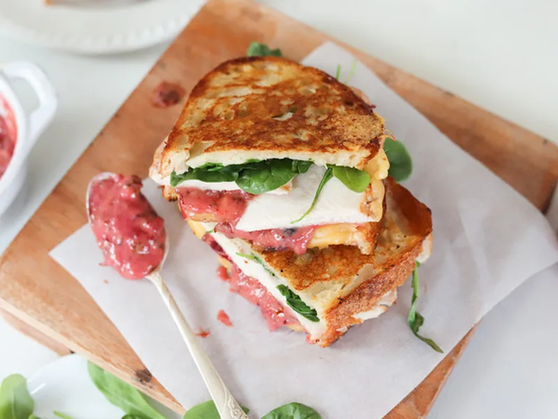Buttery sourdough sandwich pressed until crispy, filled with sliced turkey breast, melted Gouda, peppery arugula, and a smoky-sweet chipotle cranberry mayo. The chipotle adds heat and depth while cranberry brings fruity brightness, creating a balanced, sophisticated lunch or dinner option. Perfect for using leftover holiday turkey or deli-counter sliced breast.
