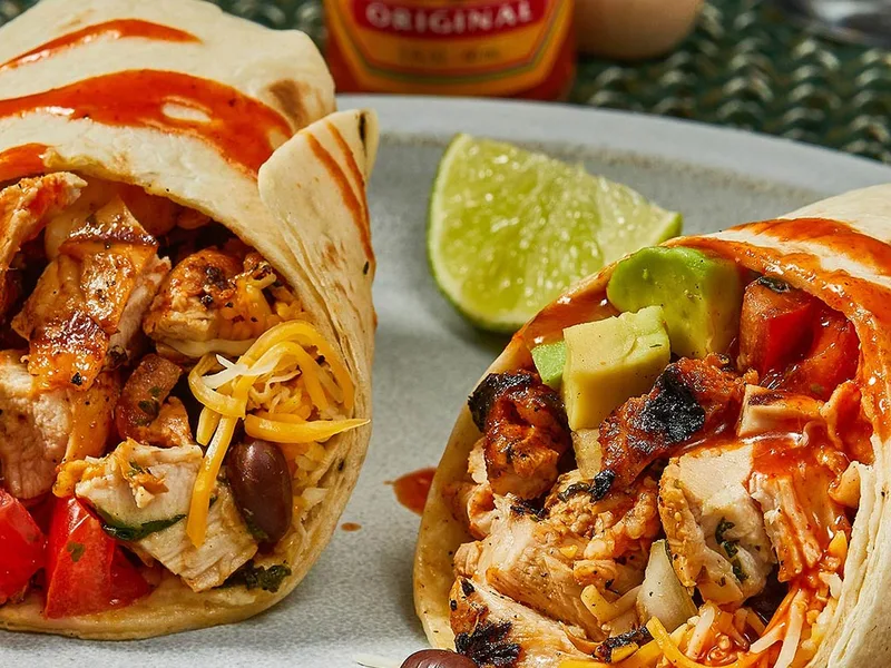 Marinated boneless chicken thighs grilled with citrus, agave, and cilantro, then shredded and wrapped in flour tortillas with black beans, Mexican cheese, pico de gallo, and avocado. The reserved marinade bastes the chicken during grilling for added flavor depth.