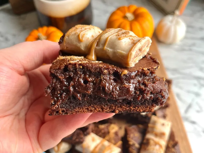 Rich, fudgy brownies made with aquafaba meringue and instant coffee, swirled with pumpkin spice and topped with caramelised biscuit wafer bars. The aquafaba creates a glossy, thick batter that bakes into a dense centre with gooey pockets. Vegan-friendly using margarine and plant-based egg substitute.