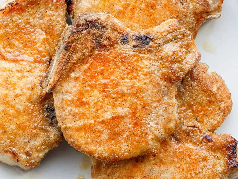 Score the fat cap on pork chops to prevent curling during cooking and ensure even browning.