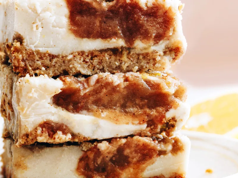 No-bake vegan cheesecake bars featuring a nutty oat-almond crust, creamy cashew filling brightened with lemon, and swirled apple butter, topped with a cinnamon crumble. Naturally gluten-free when certified oats used. Perfect for potlucks, meal prep, or dairy-free celebrations. The combination of tart lemon, sweet maple, and warm cinnamon creates balanced flavor without processed ingredients.