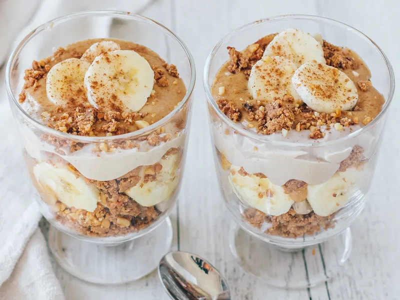 A layered vegan parfait that transforms Medjool dates into creamy caramel sauce, delivering indulgent sweetness without refined sugar. The base combines soaked dates, coconut milk, and nut butter blended until silky, creating a naturally sweet caramel layer that rivals traditional versions. Topped with protein-fortified yogurt, crumbled peanut butter energy bars, and fresh banana slices, each spoonful offers contrasting textures: creamy, crunchy, and soft. This dish suits anyone seeking plant-based protein options, from fitness enthusiasts to vegans exploring whole-food sweeteners. Serve as a high-protein breakfast, post-workout recovery meal, or elegant dessert. What sets this version apart is the date-based caramel—naturally sweetened and nutrient-dense—combined with multiple protein sources (yogurt, powder, bars) that make it satisfying and functional without artificial ingredients or excessive processing.