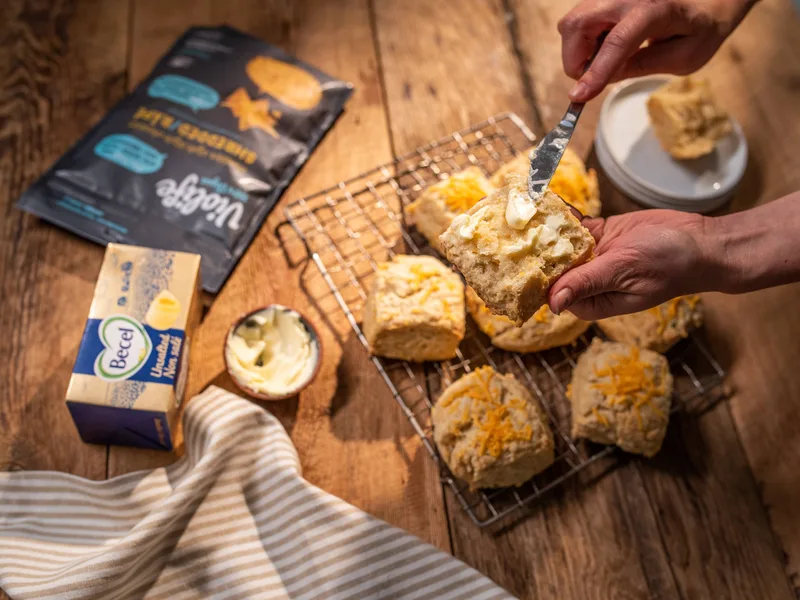 Flaky vegan scones made with plant-based butter and Violife cheddar-style cheese, brightened with fresh thyme. The dough is laminated through folding to create tender, layered scones with crispy golden tops, brushed with melted plant butter and topped with extra vegan cheese.