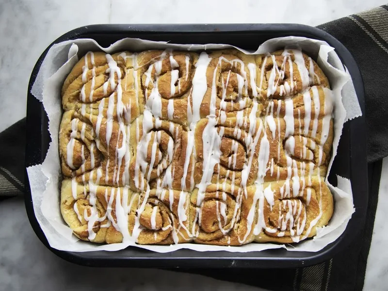When glazing, add milk slowly to avoid runny icing. Consistency should coat the back of a spoon and drip slowly; too thick won't flow, too thin slides off.