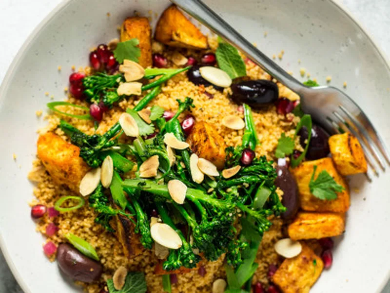 Stir chopped onion, pomegranate seeds, and olives into couscous. Top with roasted parsnips and stir-fried broccoli. Garnish with toasted almonds, fresh herbs, and pepper.