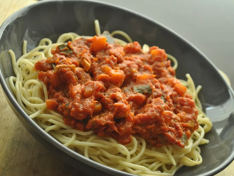 Vegan Lentil Bolognese with Roasted Vegetables