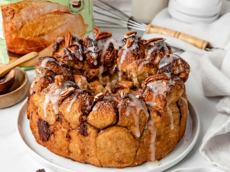 Monkey bread is a pull-apart coffee cake made from small dough balls tossed in cinnamon sugar, stacked in a bundt pan, and baked until golden and caramelized. This vegan version replaces dairy with plant-based milk and margarine while keeping the showstopping presentation intact. The combination of warm cinnamon, melted chocolate chunks, and toasted pecans creates layers of flavor and texture that make each pull satisfying. The dough is soft and slightly sweet, the exterior develops a crispy-caramelized coating, and hidden pockets of chocolate add richness. Perfect for weekend breakfasts, brunch gatherings, or holiday mornings, this bread impresses guests while remaining completely plant-based. What sets this version apart is the careful balance of spices in both the dough and coating, plus the dark chocolate and pecan garnish that enhances it beyond basic cinnamon-sugar versions.