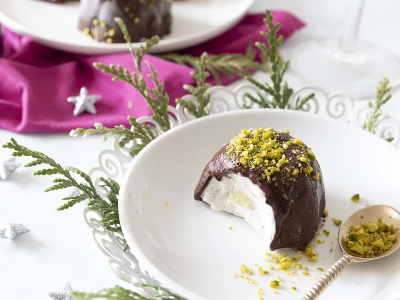 A showstopping frozen dessert with hidden pistachio centers and vegan coconut mousse. This elegant treat combines a creamy aquafaba-based stracciatella mousse infused with coconut cream, a pistachio-oil core, and a glossy dark chocolate shell that shatters when you bite through. The contrast between the frozen coconut mousse and pistachio paste creates a luxurious sensory experience. The chocolate coating sets dramatically against the cold filling, making each spoonful feel indulgent. Perfect for experienced home bakers seeking an impressive dinner party finale or special occasion dessert. Serve after chilling to let the mousse soften slightly, revealing the hidden pistachio surprise within. This French-inspired frozen mystère uses plant-based aquafaba as an egg replacement, delivering the same silky texture as traditional recipes while remaining entirely vegan.