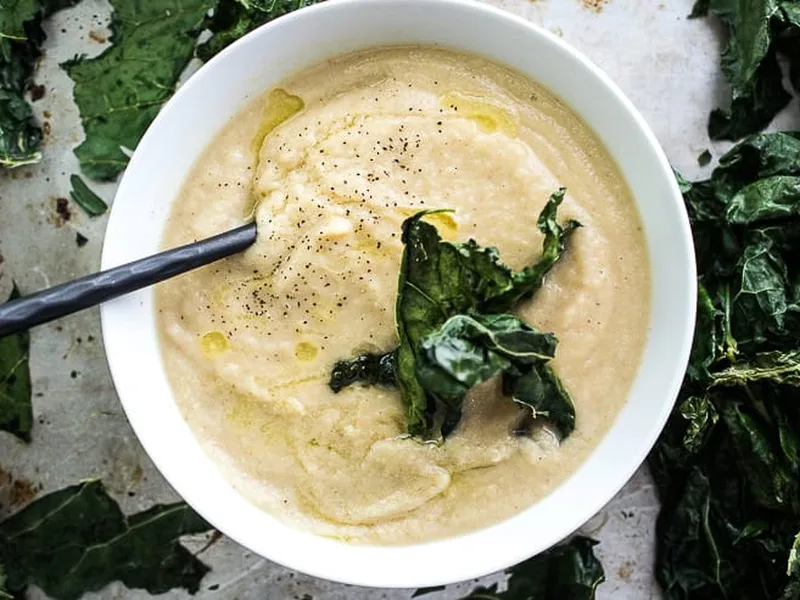 Roasted Cauliflower White Bean Soup with Kale Chips