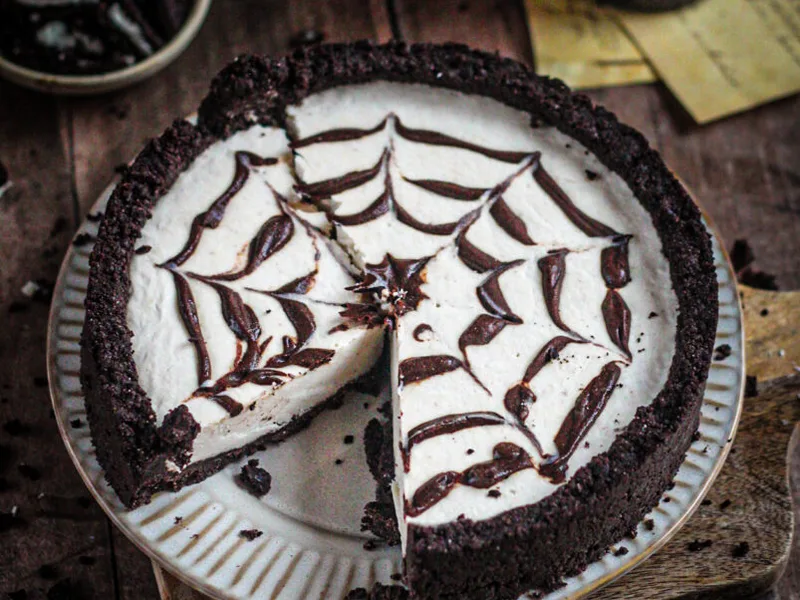 A show-stopping vegan Halloween cheesecake featuring a crispy Oreo cookie base and creamy coconut-cashew filling, topped with an elegant chocolate spider web design. This dairy-free dessert combines rich cocoa flavors from crushed Oreos with smooth, tangy vegan cream cheese and coconut richness. The signature spider web—piped in dark chocolate and drawn with precise lines—makes it visually striking enough for holiday parties or themed gatherings. The filling is dense yet creamy, with subtle citrus brightness from lemon juice and warmth from vanilla. Perfect for vegans and non-vegans alike, this dessert works best when frozen solid for at least four hours, creating a fudgy texture that softens slightly at room temperature. The combination of buttery Oreo crumble, velvety filling, and dramatic web decoration sets this apart from standard cheesecake recipes, making it an ideal centerpiece for Halloween celebrations, dinner parties, or anyone seeking an impressive vegan dessert.