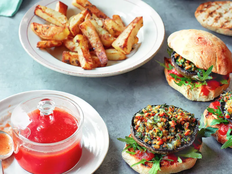Plant-based comfort food featuring meaty portobello mushroom caps filled with a savory mixture of breadcrumbs, pine nuts, and fresh herbs. The mushrooms are paired with crispy herb-roasted potato wedges and homemade tomato ketchup for a satisfying burger experience. Perfect for weekend dinners or entertaining guests who appreciate creative vegan cuisine. The combination of textures from the tender mushrooms, crunchy stuffing, and golden potatoes creates a well-balanced meal that rivals any traditional burger.