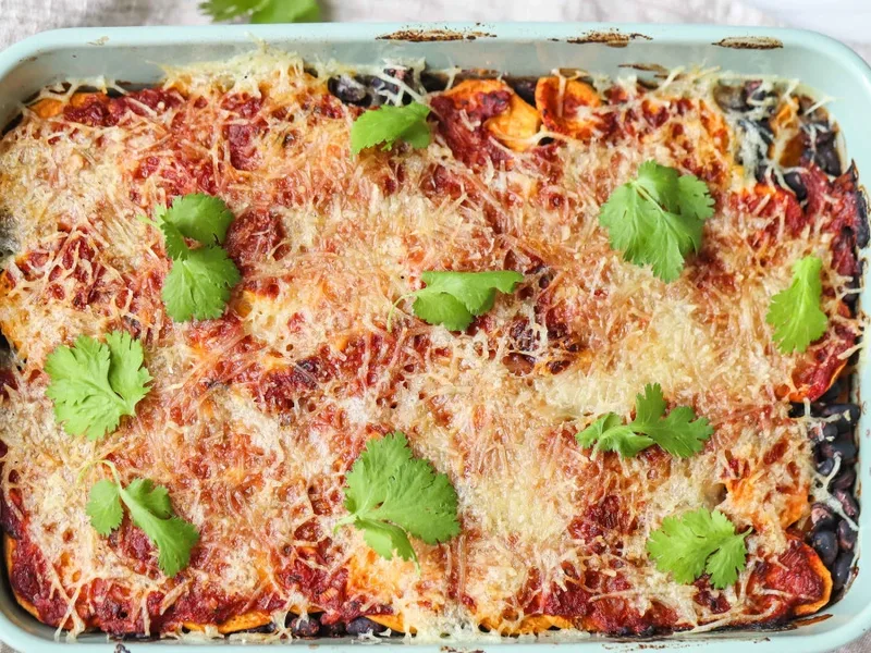 A hearty vegan bake that layers tender sweet potato slices with seasoned black beans and a rich tomato sauce base, topped with melted vegan cheese. This dish combines earthy cumin and smoky paprika with umami-forward tomato, creating depth without animal products. The contrast between creamy beans, soft potatoes, and crispy-edged cheese makes it substantial enough for mains yet vegetable-forward. Perfect for weeknight dinners, meal prep, or feeding omnivores and vegans together. What sets this version apart is the triple-layer structure that builds flavor through each component while keeping preparation straightforward, plus the final cheese finish that provides richness and visual appeal.