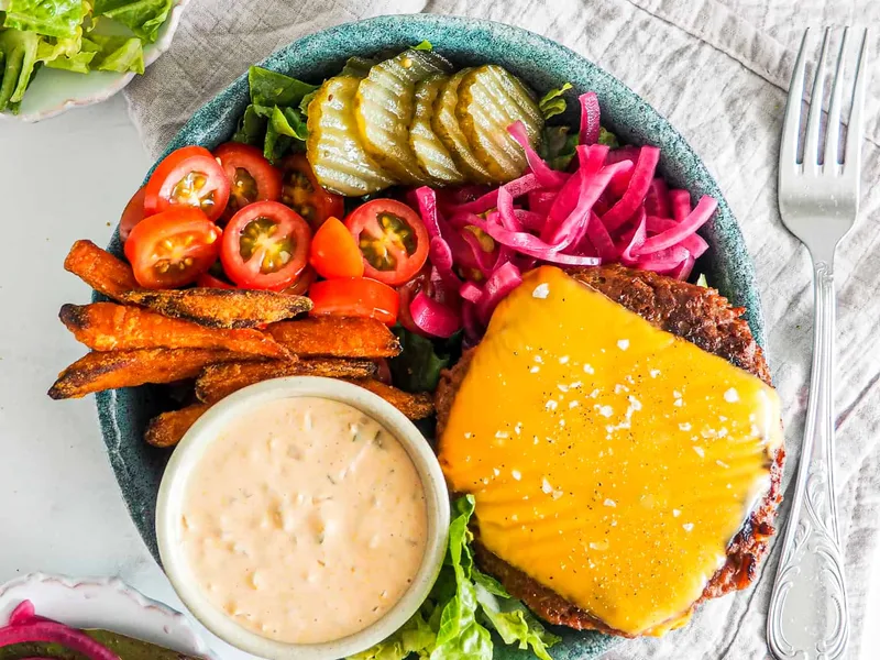Plant-based burger bowl featuring crispy sweet potato fries, tender lettuce, cherry tomatoes, pickled onions and cucumbers, plant-based patties topped with cheddar, and a homemade Big Mac-style dressing of mayo, ketchup, mustard, and pickled cucumber brine. Arranged for visual appeal and served with dressing on the side.